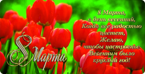 Кружка с изображением красных тюльпанов и стихотворением, с надписью "8 марта".
