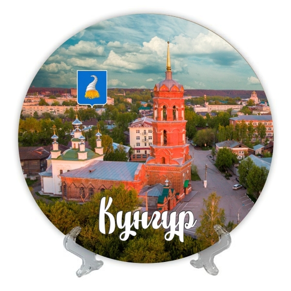 Тарелка керамическая сувенирная диаметром 16 см с достопримечательностями города Кунгур. Изображение полноцветное. В комплекте индивидуальная коробка, подвес и пластиковая подставка. Изображение стойкое, поверхность глянцевая.