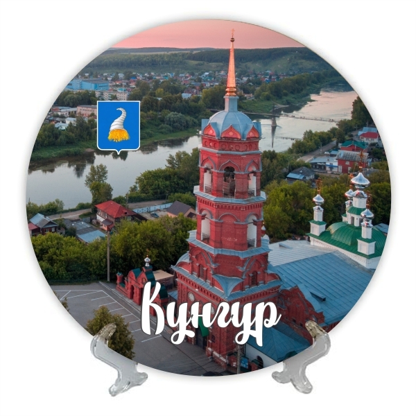 Тарелка керамическая сувенирная диаметром 16 см с достопримечательностями города Кунгур. Изображение полноцветное. В комплекте индивидуальная коробка, подвес и пластиковая подставка. Изображение стойкое, поверхность глянцевая.