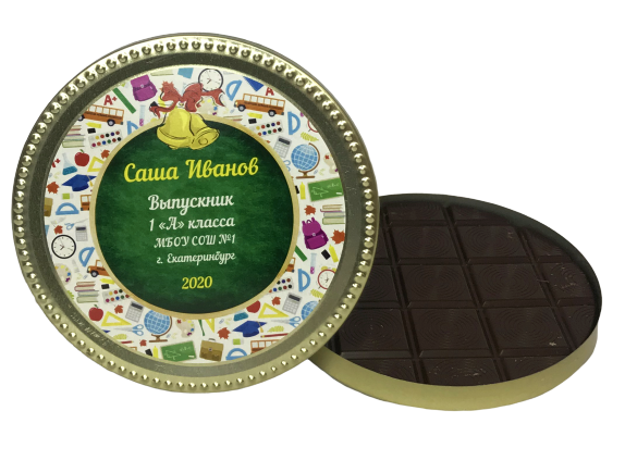 Шоколадная медаль 10 см в диаметре из вкуснейшего тёмного шоколада 52% какао. Масса нетто 65 г. Состав: какао тёртое, сахар, масло какао, эмкльгатор: соевый лецитин, ароматизатор "Ванилин" идентичный натуральному, эмульгатор: Е476. Энергетическая ценноть 530 ккал.