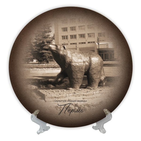 Тарелка керамическая сувенирная диаметром 16 см с достопримечательностями города Пермь. Изображение полноцветное. В комплекте индивидуальная коробка, подвес и пластиковая подставка. Изображение стойкое, поверхность глянцевая.