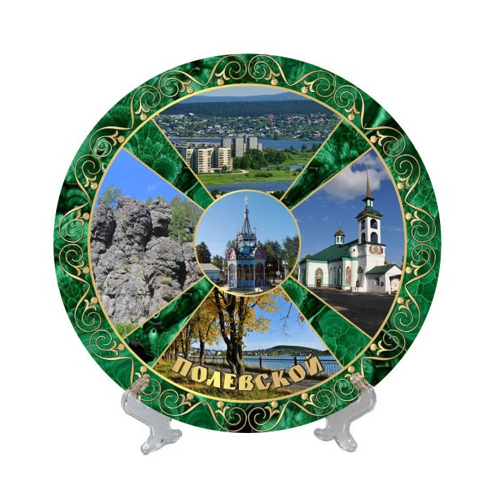 Тарелка керамическая сувенирная диаметром 21 см с видами города Полевской. Изображение полноцветное. В комплекте индивидуальная коробка, подвес и пластиковая подставка.