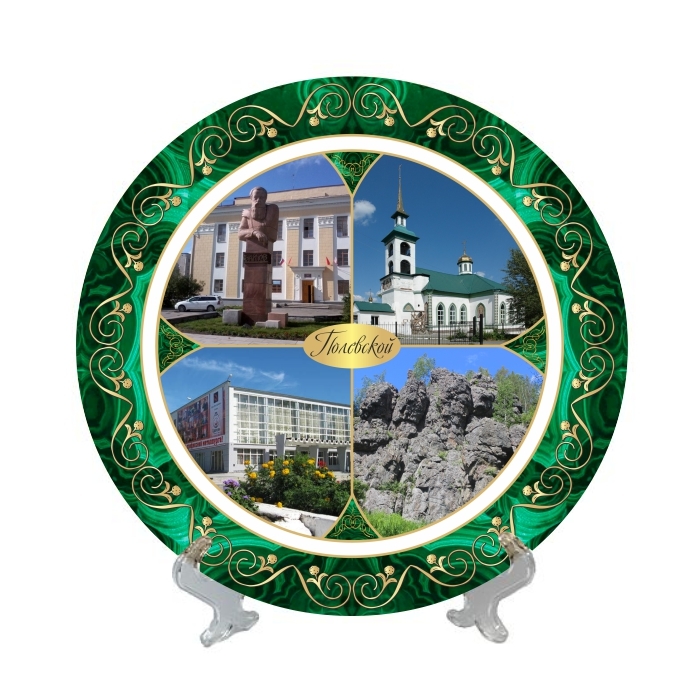Тарелка керамическая сувенирная диаметром 21 см с видами города Полевской. Изображение полноцветное. В комплекте индивидуальная коробка, подвес и пластиковая подставка.